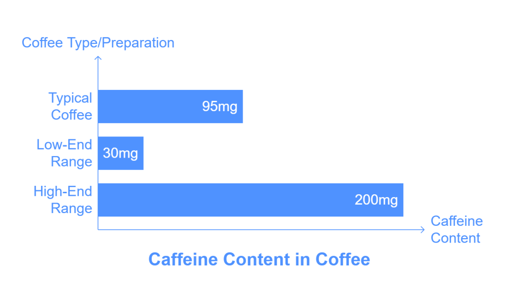 The caffeine content in coffee can vary widely depending on the type, preparation method, and serving size. A typical 8-ounce (240-milliliter) cup of coffee contains about 95 milligrams of caffeine, but this can range from 30 to 200 milligrams.