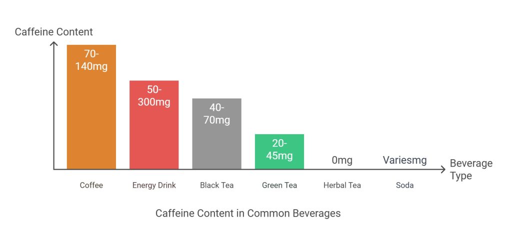 Other popular caffeinated beverages like tea and soda also vary in their caffeine content. A cup of black tea typically contains around 40 to 70 mg of caffeine, while green tea usually has around 20 to 45 mg. Herbal teas, such as chamomile or peppermint, are generally caffeine-free.