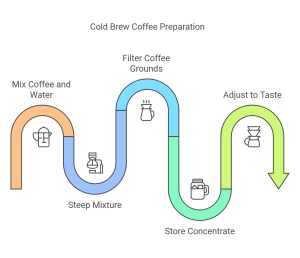 Cold brew coffee is a method of brewing coffee that involves steeping coarsely ground coffee beans in cold or room temperature water for an extended period, typically between 12 to 24 hours. This process extracts the coffee’s flavors without the bitterness often associated with hot brewing methods.